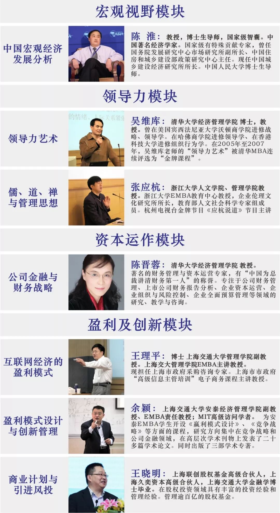 上海交通大学、清华大学等一流学府资深EMBA专家阵容及国家级智库,代表中国南北领先高学府风格,传授最精彩理念,提供前沿解决方案。