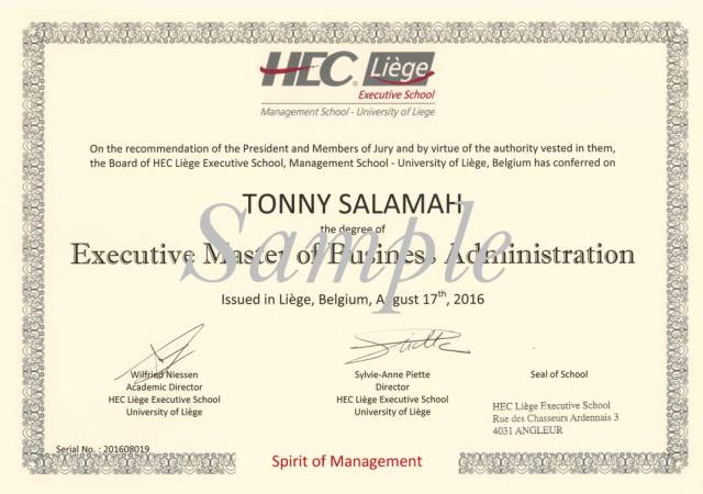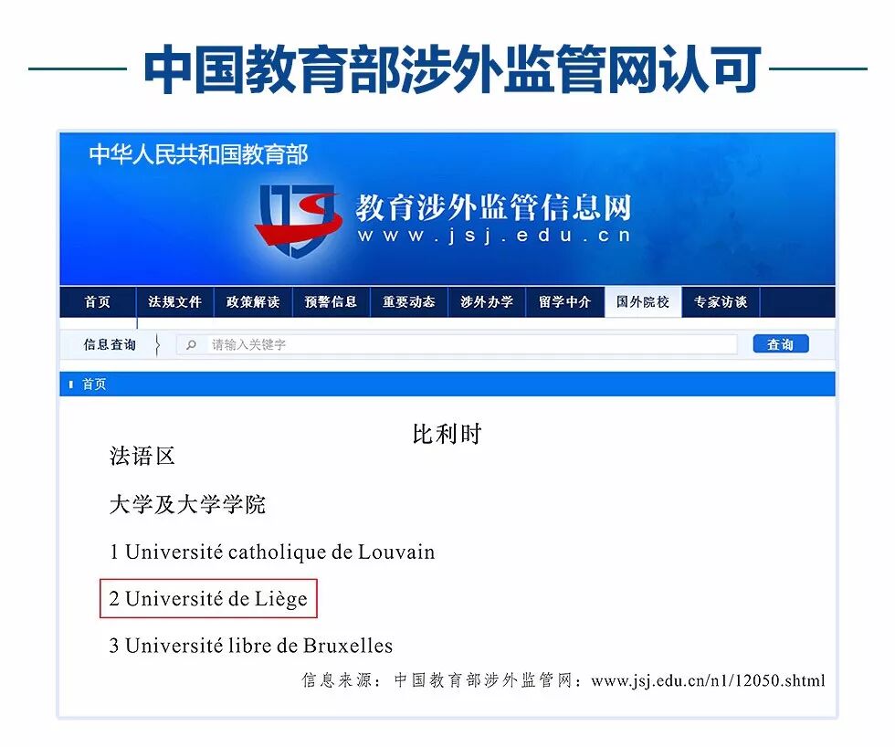 比利时列日大学(University of Liege)在全球的排名中,名列全球QS排名第265位(2015年),受到中国教育部涉外监管网认可,列日大学高商管理学院(Hec Liege Management School)具有EQUIS(欧洲管理发展基金会EFMD)以及AACSB(美国国际高等商学院协会)的两项顶级国际认证,该校颁发的EMBA学位证书在国际上获得广泛的认可。